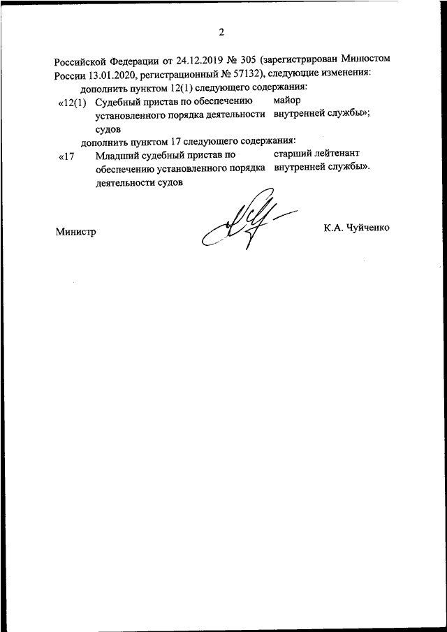 "О ВНЕСЕНИИ ИЗМЕНЕНИЙ В ПЕРЕЧЕНЬ ДОЛЖНОСТЕЙ, ЗАМЕЩАЕМЫХ ЛИЦАМИ СРЕДНЕГО И СТАРШЕГО НАЧАЛЬСТВУЮЩЕГО СОСТАВА В ЦЕНТРАЛЬНОМ АППАРАТЕ ФЕДЕРАЛЬНОЙ СЛУЖБЫ СУДЕБНЫХ ПРИСТАВОВ, И СООТВЕТСТВУЮЩИХ ИМ СПЕЦИАЛЬНЫХ ЗВАНИЙ, УТВЕРЖДЕННЫЙ ПРИКАЗОМ МИНИСТЕРСТВА ЮСТИЦИИ РОССИЙСКОЙ ФЕДЕРАЦИИ ОТ 24.12.2019 N 305"