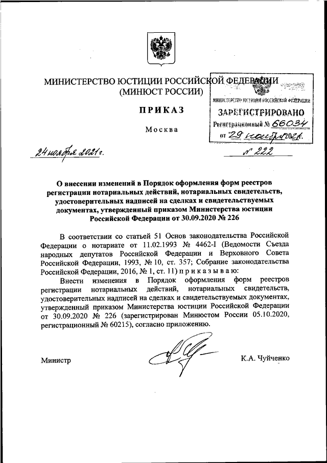ПРИКАЗ Минюста РФ от 24.11.2021 N 222