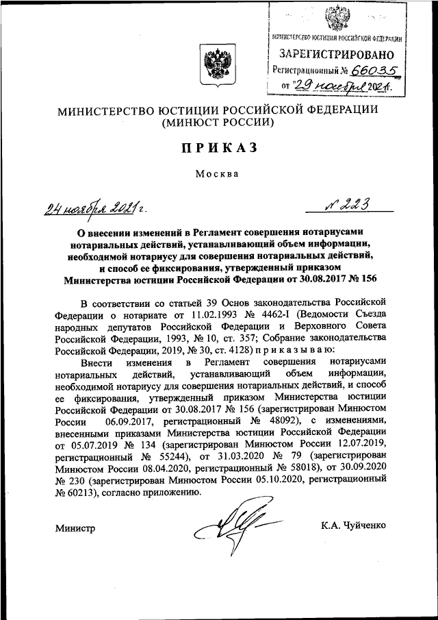 ПРИКАЗ Минюста РФ от 24.11.2021 N 223