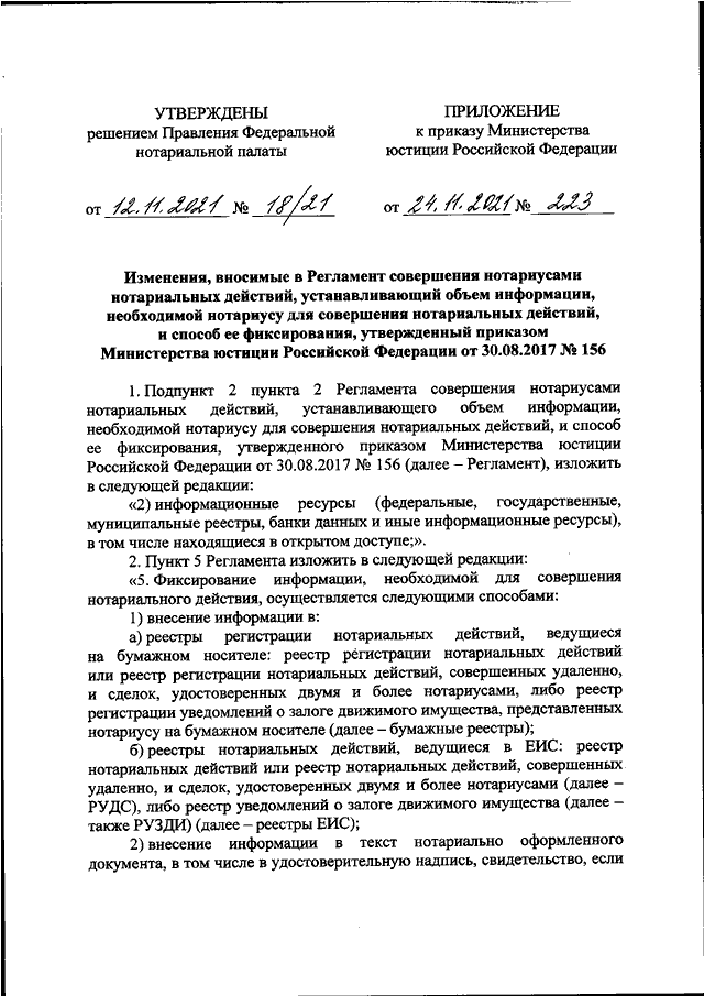 "О ВНЕСЕНИИ ИЗМЕНЕНИЙ В РЕГЛАМЕНТ СОВЕРШЕНИЯ НОТАРИУСАМИ НОТАРИАЛЬНЫХ ДЕЙСТВИЙ, УСТАНАВЛИВАЮЩИЙ ОБЪЕМ ИНФОРМАЦИИ, НЕОБХОДИМОЙ НОТАРИУСУ ДЛЯ СОВЕРШЕНИЯ НОТАРИАЛЬНЫХ ДЕЙСТВИЙ, И СПОСОБ ЕЕ ФИКСИРОВАНИЯ, УТВЕРЖДЕННЫЙ ПРИКАЗОМ МИНИСТЕРСТВА ЮСТИЦИИ РОССИЙСКОЙ ФЕДЕРАЦИИ ОТ 30.08.2017 N 156"