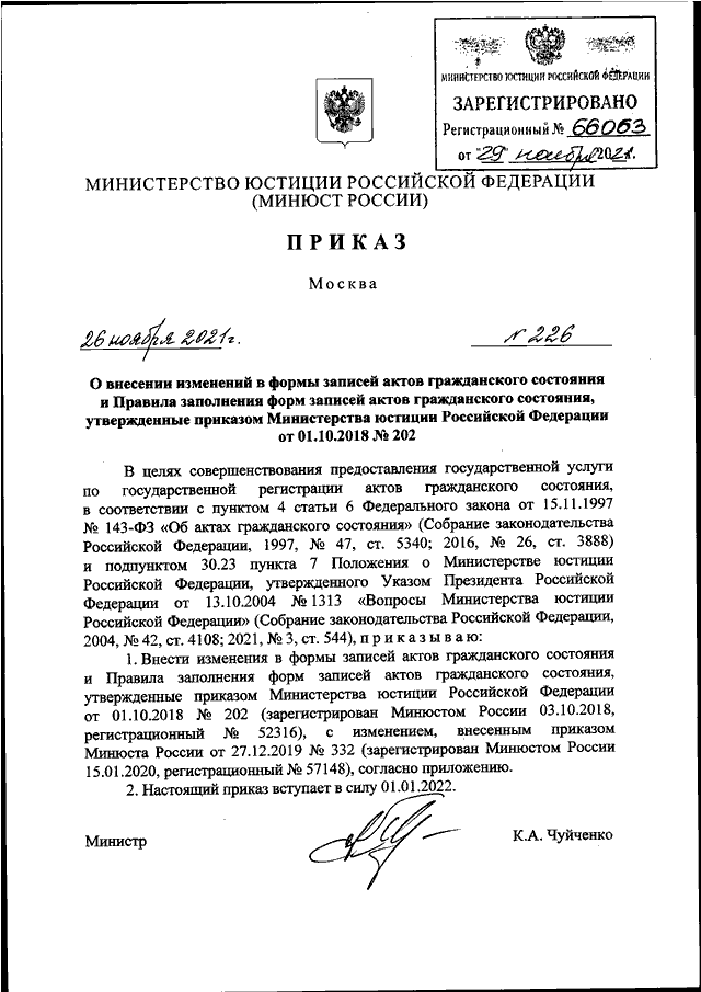 ПРИКАЗ Минюста РФ от 26.11.2021 N 226