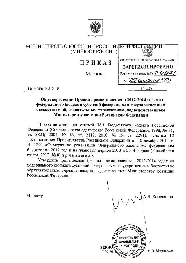 ПРИКАЗ Минюста РФ от 16.07.2012 N 137