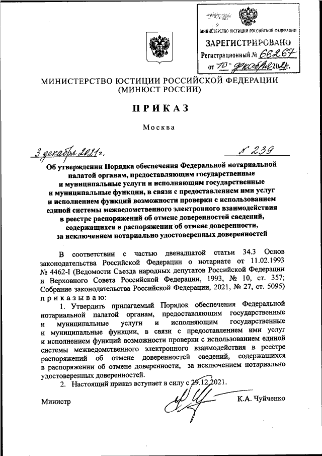 ПРИКАЗ Минюста РФ от 03.12.2021 N 239
