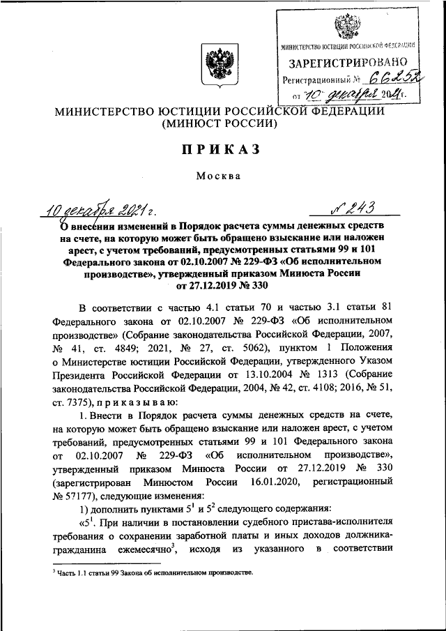 "О ВНЕСЕНИИ ИЗМЕНЕНИЙ В ПОРЯДОК РАСЧЕТА СУММЫ ДЕНЕЖНЫХ СРЕДСТВ НА СЧЕТЕ, НА КОТОРУЮ МОЖЕТ БЫТЬ ОБРАЩЕНО ВЗЫСКАНИЕ ИЛИ НАЛОЖЕН АРЕСТ, С УЧЕТОМ ТРЕБОВАНИЙ, ПРЕДУСМОТРЕННЫХ СТАТЬЯМИ 99 И 101 ФЕДЕРАЛЬНОГО ЗАКОНА ОТ 02.10.2007 N 229-ФЗ "ОБ ИСПОЛНИТЕЛЬНОМ ПРОИЗВОДСТВЕ", УТВЕРЖДЕННЫЙ ПРИКАЗОМ МИНЮСТА РОССИИ ОТ 27.12.2019 N 330"