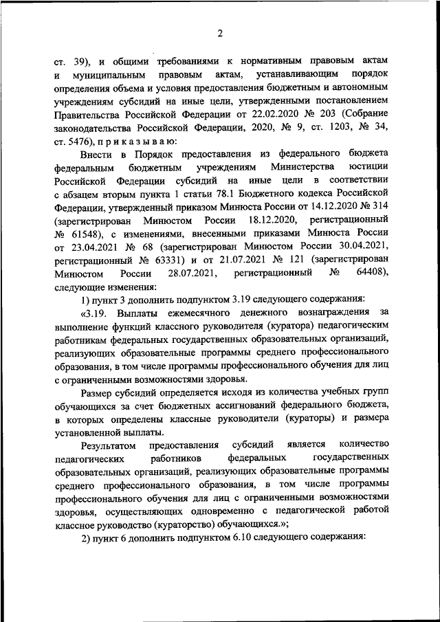"О ВНЕСЕНИИ ИЗМЕНЕНИЙ В ПОРЯДОК ПРЕДОСТАВЛЕНИЯ ИЗ ФЕДЕРАЛЬНОГО БЮДЖЕТА ФЕДЕРАЛЬНЫМ БЮДЖЕТНЫМ УЧРЕЖДЕНИЯМ МИНИСТЕРСТВА ЮСТИЦИИ РОССИЙСКОЙ ФЕДЕРАЦИИ СУБСИДИЙ НА ИНЫЕ ЦЕЛИ В СООТВЕТСТВИИ С АБЗАЦЕМ ВТОРЫМ ПУНКТА 1 СТАТЬИ 78.1 БЮДЖЕТНОГО КОДЕКСА РОССИЙСКОЙ ФЕДЕРАЦИИ, УТВЕРЖДЕННЫЙ ПРИКАЗОМ МИНЮСТА РОССИИ ОТ 14.12.2020 N 314"