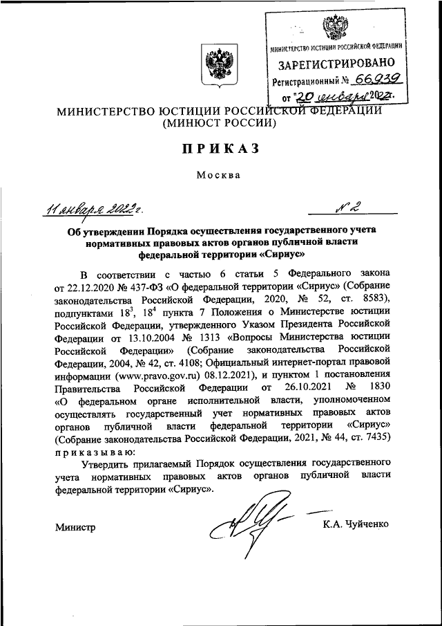 ПРИКАЗ Минюста РФ от 11.01.2022 N 2