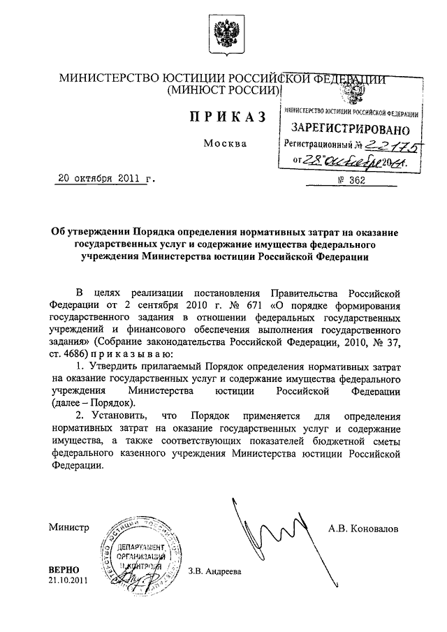 ПРИКАЗ Минюста РФ от 20.10.2011 N 362