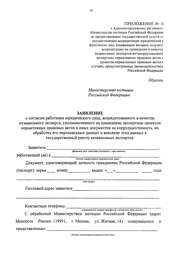 "ОБ УТВЕРЖДЕНИИ АДМИНИСТРАТИВНОГО РЕГЛАМЕНТА МИНИСТЕРСТВА ЮСТИЦИИ РОССИЙСКОЙ ФЕДЕРАЦИИ ПО ПРЕДОСТАВЛЕНИЮ ГОСУДАРСТВЕННОЙ УСЛУГИ ПО ОСУЩЕСТВЛЕНИЮ АККРЕДИТАЦИИ ЮРИДИЧЕСКИХ И ФИЗИЧЕСКИХ ЛИЦ, ИЗЪЯВИВШИХ ЖЕЛАНИЕ ПОЛУЧИТЬ АККРЕДИТАЦИЮ НА ПРОВЕДЕНИЕ В КАЧЕСТВЕ НЕЗАВИСИМЫХ ЭКСПЕРТОВ АНТИКОРРУПЦИОННОЙ ЭКСПЕРТИЗЫ НОРМАТИВНЫХ ПРАВОВЫХ АКТОВ И ПРОЕКТОВ НОРМАТИВНЫХ ПРАВОВЫХ АКТОВ В СЛУЧАЯХ, ПРЕДУСМОТРЕННЫХ ЗАКОНОДАТЕЛЬСТВОМ РОССИЙСКОЙ ФЕДЕРАЦИИ"