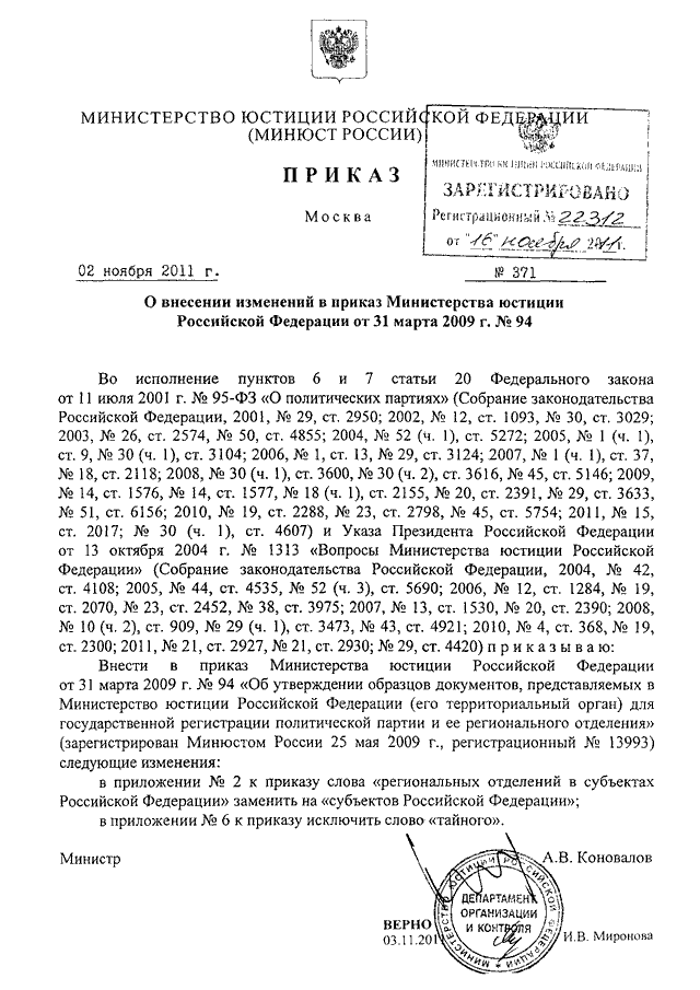 ПРИКАЗ Минюста РФ от 02.11.2011 N 371