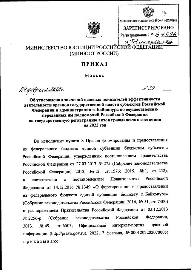 ПРИКАЗ Минюста РФ от 24.02.2022 N 30