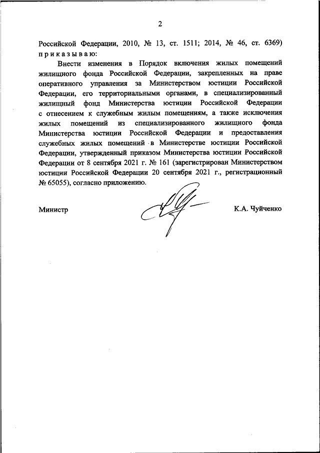 "О ВНЕСЕНИИ ИЗМЕНЕНИЙ В ПОРЯДОК ВКЛЮЧЕНИЯ ЖИЛЫХ ПОМЕЩЕНИЙ ЖИЛИЩНОГО ФОНДА РОССИЙСКОЙ ФЕДЕРАЦИИ, ЗАКРЕПЛЕННЫХ НА ПРАВЕ ОПЕРАТИВНОГО УПРАВЛЕНИЯ ЗА МИНИСТЕРСТВОМ ЮСТИЦИИ РОССИЙСКОЙ ФЕДЕРАЦИИ, ЕГО ТЕРРИТОРИАЛЬНЫМИ ОРГАНАМИ, В СПЕЦИАЛИЗИРОВАННЫЙ ЖИЛИЩНЫЙ ФОНД МИНИСТЕРСТВА ЮСТИЦИИ РОССИЙСКОЙ ФЕДЕРАЦИИ С ОТНЕСЕНИЕМ К СЛУЖЕБНЫМ ЖИЛЫМ ПОМЕЩЕНИЯМ, А ТАКЖЕ ИСКЛЮЧЕНИЯ ЖИЛЫХ ПОМЕЩЕНИЙ ИЗ СПЕЦИАЛИЗИРОВАННОГО ЖИЛИЩНОГО ФОНДА МИНИСТЕРСТВА ЮСТИЦИИ РОССИЙСКОЙ ФЕДЕРАЦИИ И ПРЕДОСТАВЛЕНИЯ СЛУЖЕБНЫХ ЖИЛЫХ ПОМЕЩЕНИЙ В МИНИСТЕРСТВЕ ЮСТИЦИИ РОССИЙСКОЙ ФЕДЕРАЦИИ, УТВЕРЖДЕННЫЙ ПРИКАЗОМ МИНИСТЕРСТВА ЮСТИЦИИ РОССИЙСКОЙ ФЕДЕРАЦИИ ОТ 8 СЕНТЯБРЯ 2021 Г. N 161"