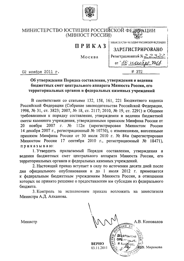 ПРИКАЗ Минюста РФ от 02.11.2011 N 372