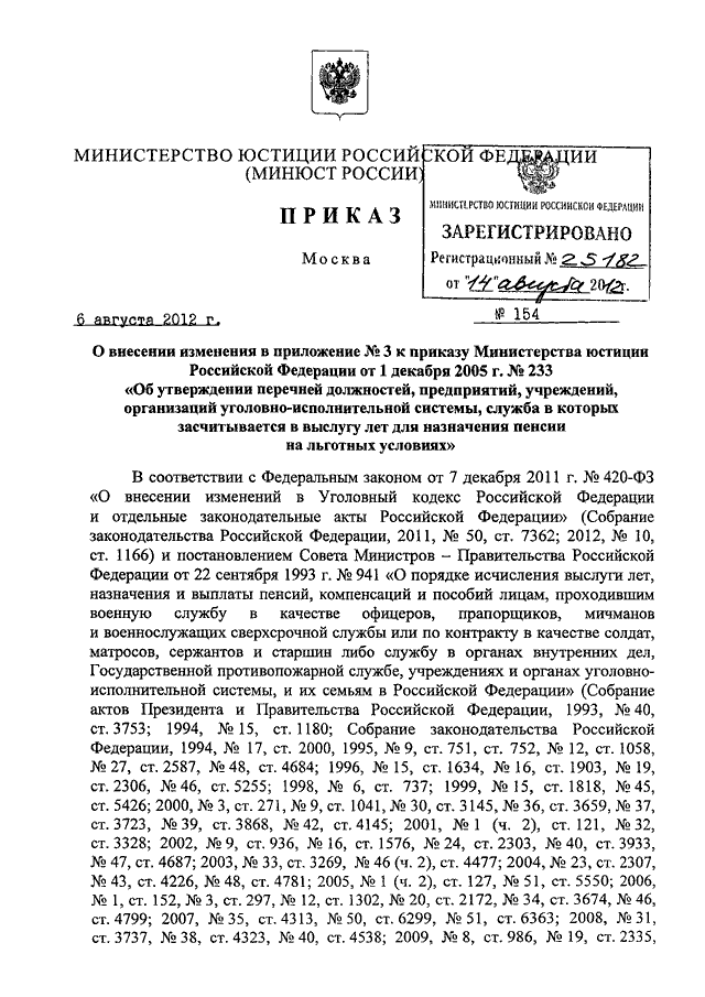 ПРИКАЗ Минюста РФ от 06.08.2012 N 154