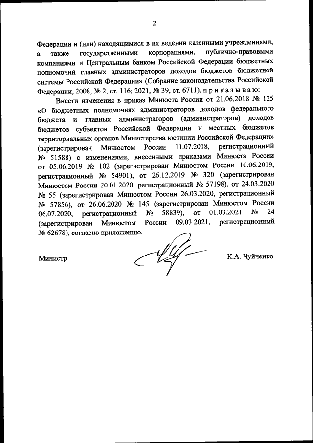 "О ВНЕСЕНИИ ИЗМЕНЕНИЙ В ПРИКАЗ МИНЮСТА РОССИИ ОТ 21.06.2018 N 125 "О БЮДЖЕТНЫХ ПОЛНОМОЧИЯХ АДМИНИСТРАТОРОВ ДОХОДОВ ФЕДЕРАЛЬНОГО БЮДЖЕТА И ГЛАВНЫХ АДМИНИСТРАТОРОВ (АДМИНИСТРАТОРОВ) ДОХОДОВ БЮДЖЕТОВ СУБЪЕКТОВ РОССИЙСКОЙ ФЕДЕРАЦИИ И МЕСТНЫХ БЮДЖЕТОВ ТЕРРИТОРИАЛЬНЫХ ОРГАНОВ МИНИСТЕРСТВА ЮСТИЦИИ РОССИЙСКОЙ ФЕДЕРАЦИИ"