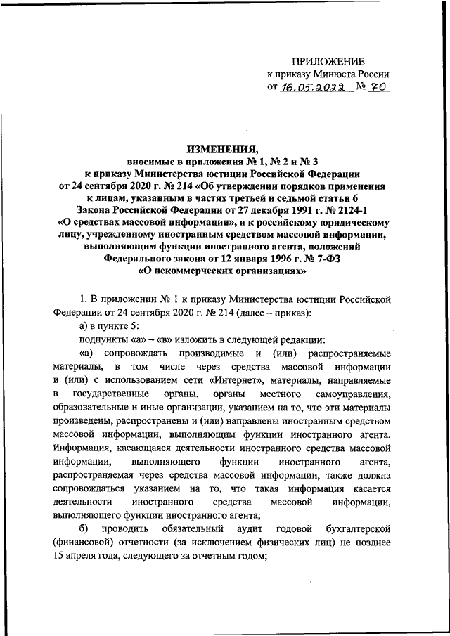 ПРИКАЗ Минюста РФ от 16.05.2022 N 70