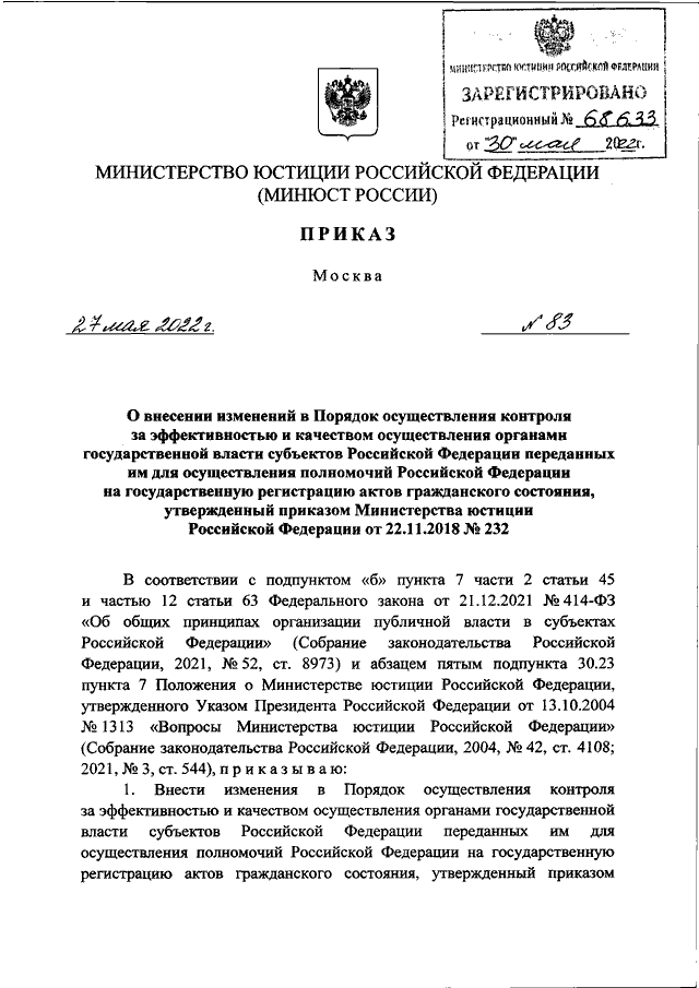 ПРИКАЗ Минюста РФ от 27.05.2022 N 83