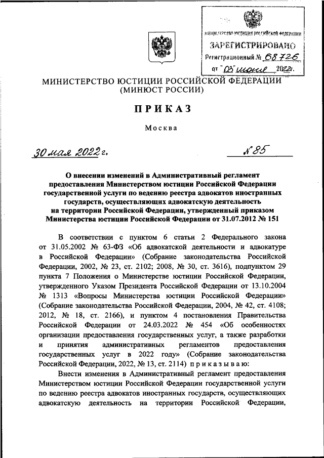 ПРИКАЗ Минюста РФ от 30.05.2022 N 85
