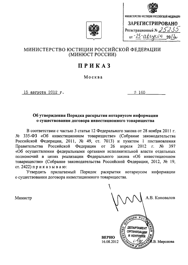 ПРИКАЗ Минюста РФ от 15.08.2012 N 160