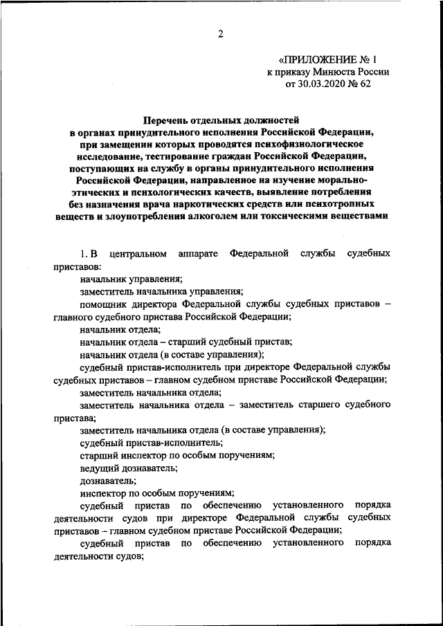 "О ВНЕСЕНИИ ИЗМЕНЕНИЯ В ПРИЛОЖЕНИЕ N 1 К ПРИКАЗУ МИНЮСТА РОССИИ ОТ 30.03.2020 N 62 "ОБ УТВЕРЖДЕНИИ ПЕРЕЧНЯ ОТДЕЛЬНЫХ ДОЛЖНОСТЕЙ В ОРГАНАХ ПРИНУДИТЕЛЬНОГО ИСПОЛНЕНИЯ РОССИЙСКОЙ ФЕДЕРАЦИИ, ПРИ ЗАМЕЩЕНИИ КОТОРЫХ ПРОВОДЯТСЯ ПСИХОФИЗИОЛОГИЧЕСКОЕ ИССЛЕДОВАНИЕ, ТЕСТИРОВАНИЕ ГРАЖДАН РОССИЙСКОЙ ФЕДЕРАЦИИ, ПОСТУПАЮЩИХ НА СЛУЖБУ В ОРГАНЫ ПРИНУДИТЕЛЬНОГО ИСПОЛНЕНИЯ РОССИЙСКОЙ ФЕДЕРАЦИИ, НАПРАВЛЕННОЕ НА ИЗУЧЕНИЕ МОРАЛЬНО - ЭТИЧЕСКИХ И ПСИХОЛОГИЧЕСКИХ КАЧЕСТВ, ВЫЯВЛЕНИЕ ПОТРЕБЛЕНИЯ БЕЗ НАЗНАЧЕНИЯ ВРАЧА НАРКОТИЧЕСКИХ СРЕДСТВ ИЛИ ПСИХОТРОПНЫХ ВЕЩЕСТВ И ЗЛОУПОТРЕБЛЕНИЯ АЛКОГОЛЕМ ИЛИ ТОКСИЧЕСКИМИ ВЕЩЕСТВАМИ, А ТАКЖЕ ПОРЯДКА ИХ ПРОВЕДЕНИЯ"