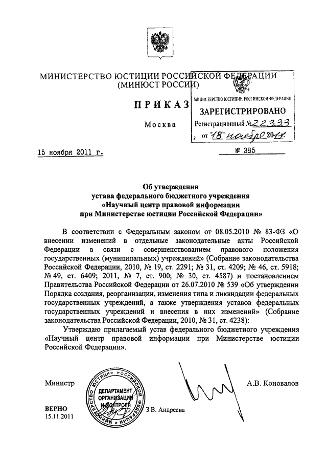 ПРИКАЗ Минюста РФ от 15.11.2011 N 385