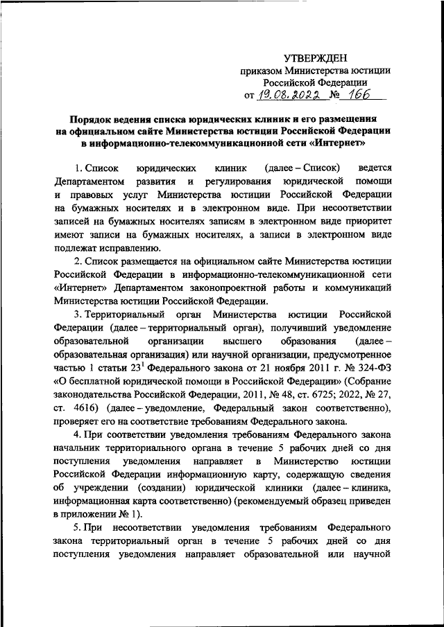 ПРИКАЗ Минюста РФ от 19.08.2022 N 166