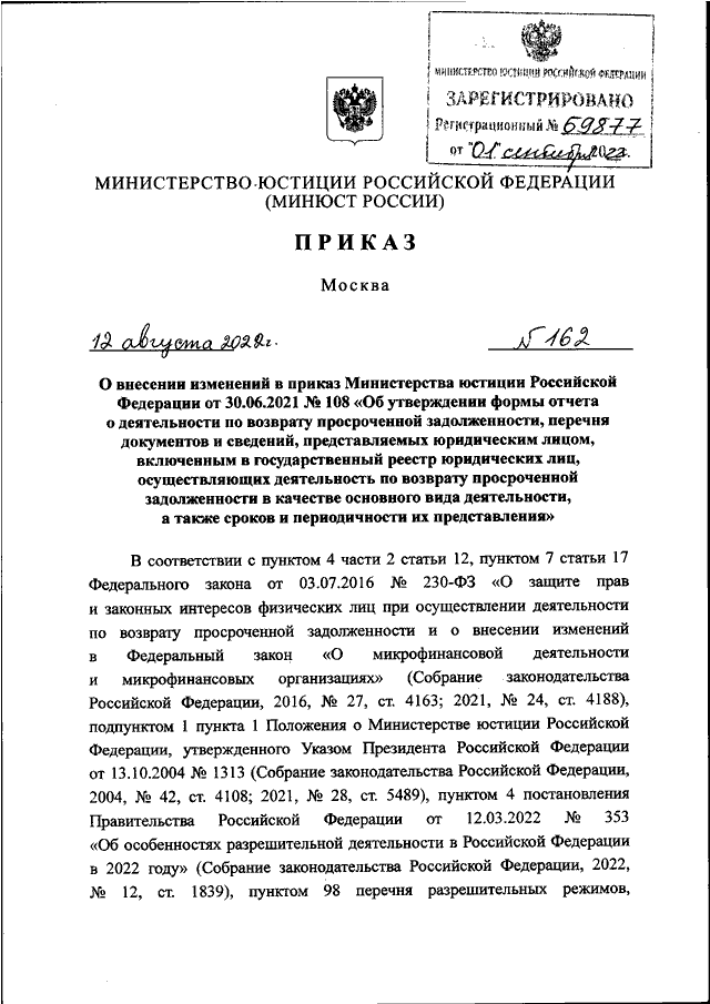 ПРИКАЗ Минюста РФ от 12.08.2022 N 162