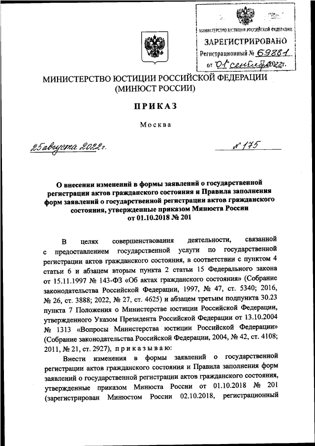 ПРИКАЗ Минюста РФ от 25.08.2022 N 175