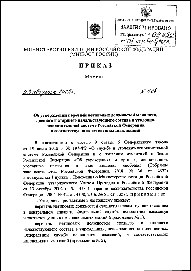 ПРИКАЗ Минюста РФ от 23.08.2022 N 168