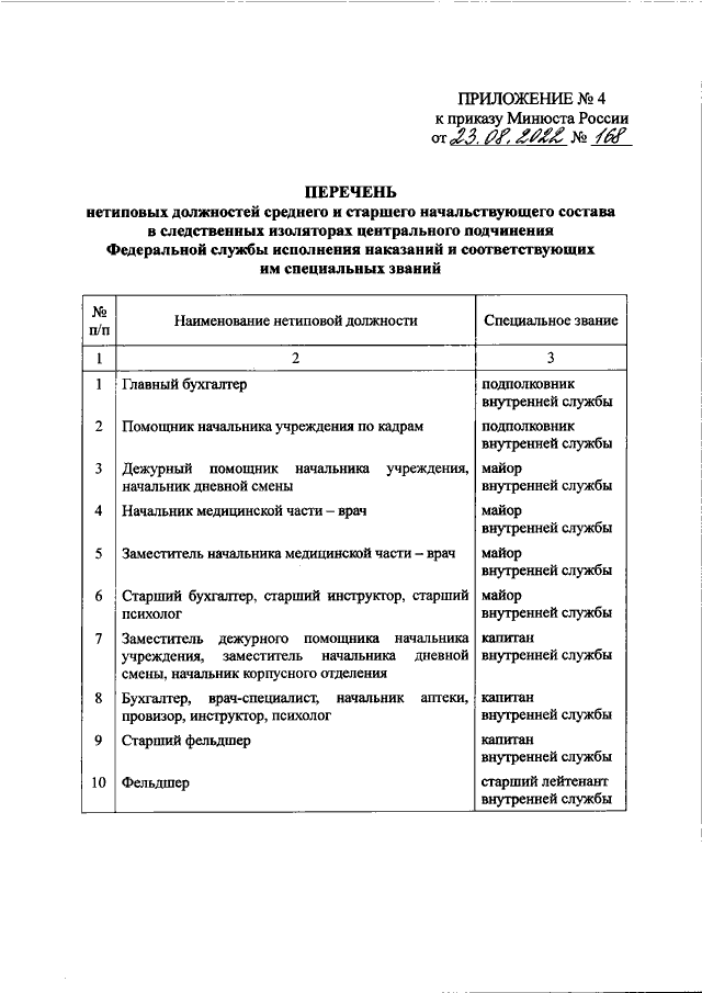"ОБ УТВЕРЖДЕНИИ ПЕРЕЧНЕЙ НЕТИПОВЫХ ДОЛЖНОСТЕЙ МЛАДШЕГО, СРЕДНЕГО И СТАРШЕГО НАЧАЛЬСТВУЮЩЕГО СОСТАВА В УГОЛОВНО - ИСПОЛНИТЕЛЬНОЙ СИСТЕМЕ РОССИЙСКОЙ ФЕДЕРАЦИИ И СООТВЕТСТВУЮЩИХ ИМ СПЕЦИАЛЬНЫХ ЗВАНИЙ"
