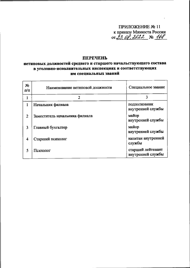 "ОБ УТВЕРЖДЕНИИ ПЕРЕЧНЕЙ НЕТИПОВЫХ ДОЛЖНОСТЕЙ МЛАДШЕГО, СРЕДНЕГО И СТАРШЕГО НАЧАЛЬСТВУЮЩЕГО СОСТАВА В УГОЛОВНО - ИСПОЛНИТЕЛЬНОЙ СИСТЕМЕ РОССИЙСКОЙ ФЕДЕРАЦИИ И СООТВЕТСТВУЮЩИХ ИМ СПЕЦИАЛЬНЫХ ЗВАНИЙ"