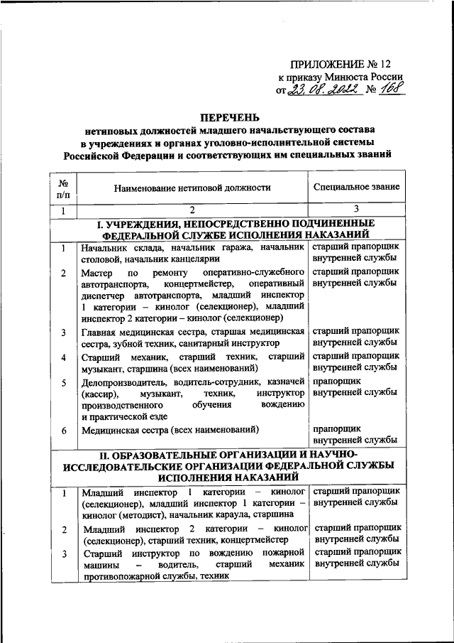 "ОБ УТВЕРЖДЕНИИ ПЕРЕЧНЕЙ НЕТИПОВЫХ ДОЛЖНОСТЕЙ МЛАДШЕГО, СРЕДНЕГО И СТАРШЕГО НАЧАЛЬСТВУЮЩЕГО СОСТАВА В УГОЛОВНО - ИСПОЛНИТЕЛЬНОЙ СИСТЕМЕ РОССИЙСКОЙ ФЕДЕРАЦИИ И СООТВЕТСТВУЮЩИХ ИМ СПЕЦИАЛЬНЫХ ЗВАНИЙ"