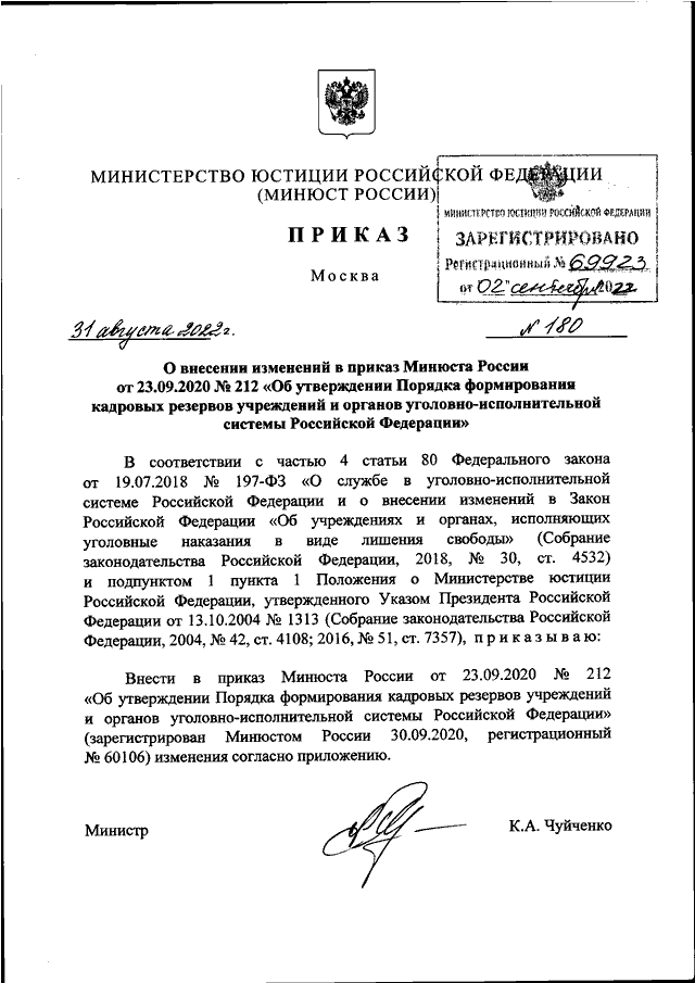 ПРИКАЗ Минюста РФ от 31.08.2022 N 180
