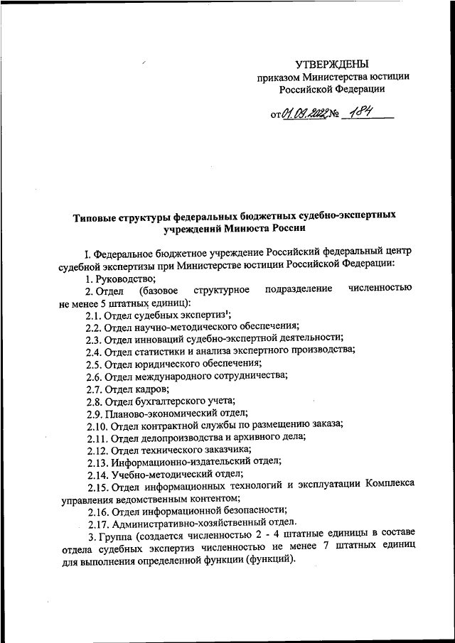 ПРИКАЗ Минюста РФ от 01.09.2022 N 184