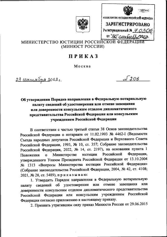 ПРИКАЗ Минюста РФ от 29.09.2022 N 208