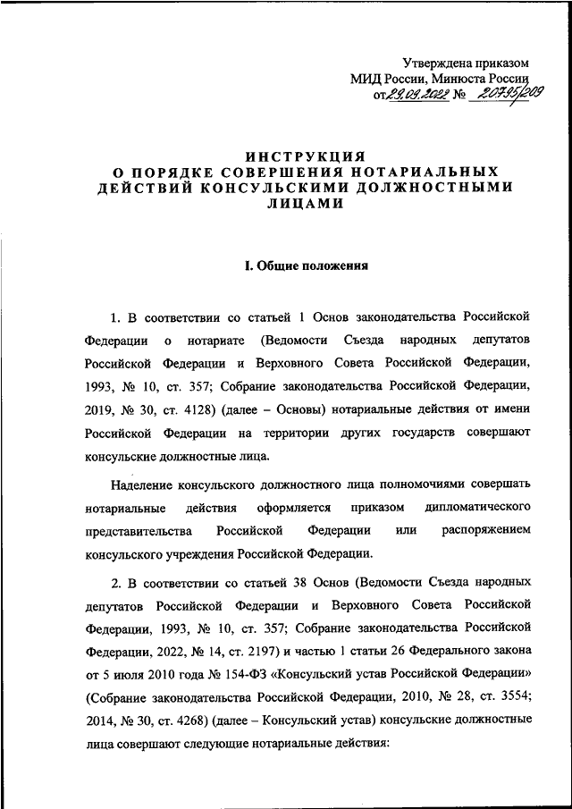 ПРИКАЗ МИД РФ N 20795, Минюста РФ N 209 от 29.09.2022