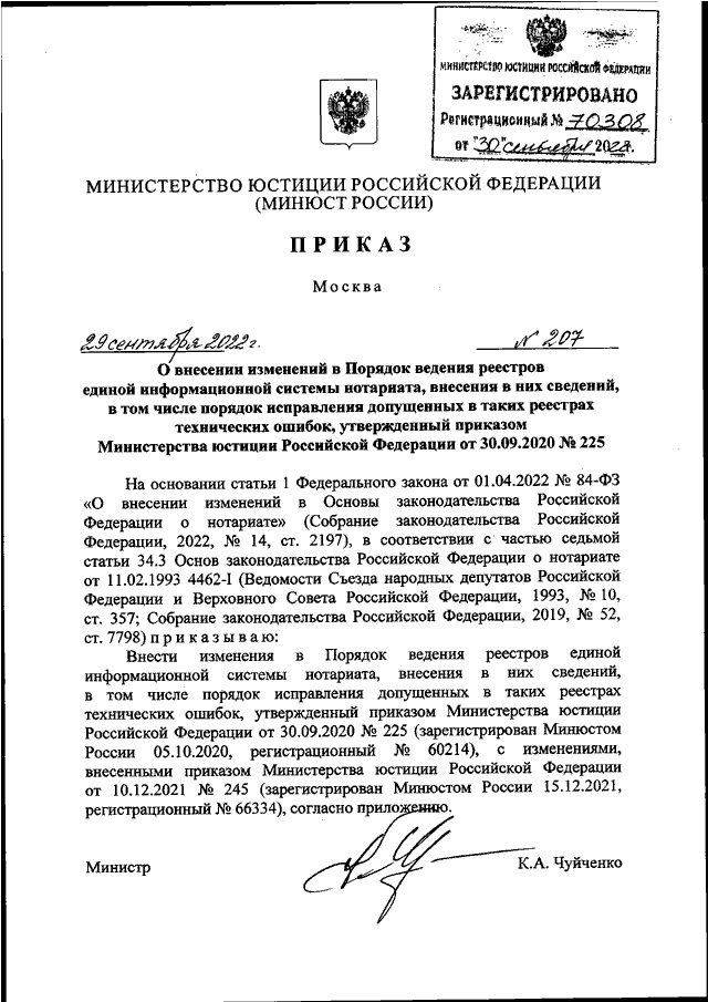 ПРИКАЗ Минюста РФ от 29.09.2022 N 207