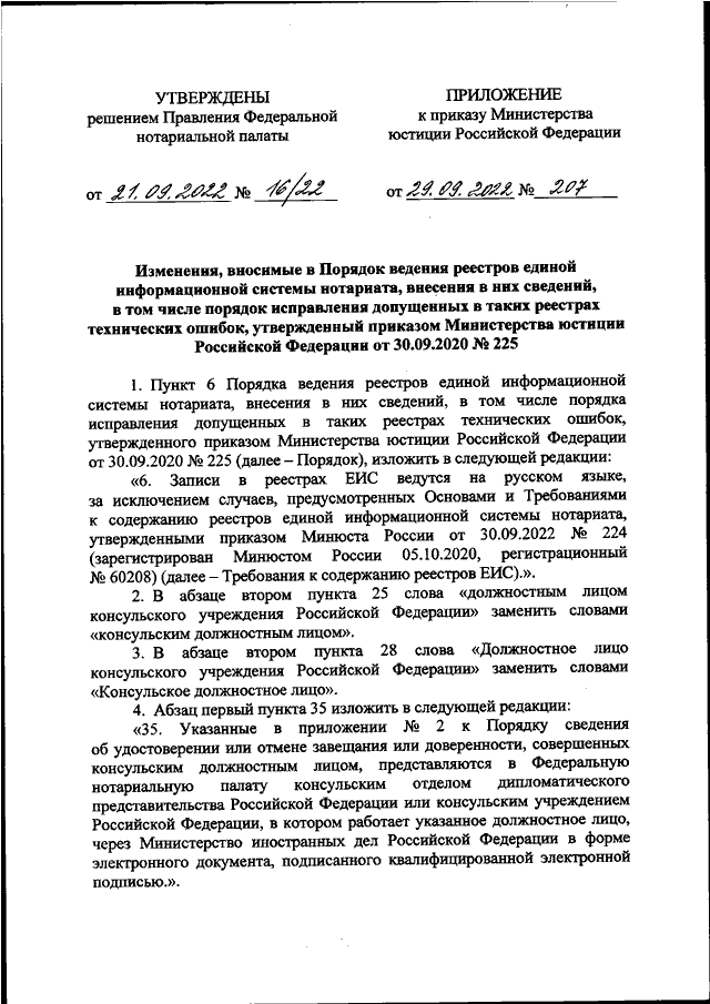 "О ВНЕСЕНИИ ИЗМЕНЕНИЙ В ПОРЯДОК ВЕДЕНИЯ РЕЕСТРОВ ЕДИНОЙ ИНФОРМАЦИОННОЙ СИСТЕМЫ НОТАРИАТА, ВНЕСЕНИЯ В НИХ СВЕДЕНИЙ, В ТОМ ЧИСЛЕ ПОРЯДОК ИСПРАВЛЕНИЯ ДОПУЩЕННЫХ В ТАКИХ РЕЕСТРАХ ТЕХНИЧЕСКИХ ОШИБОК, УТВЕРЖДЕННЫЙ ПРИКАЗОМ МИНИСТЕРСТВА ЮСТИЦИИ РОССИЙСКОЙ ФЕДЕРАЦИИ ОТ 30.09.2020 N 225"