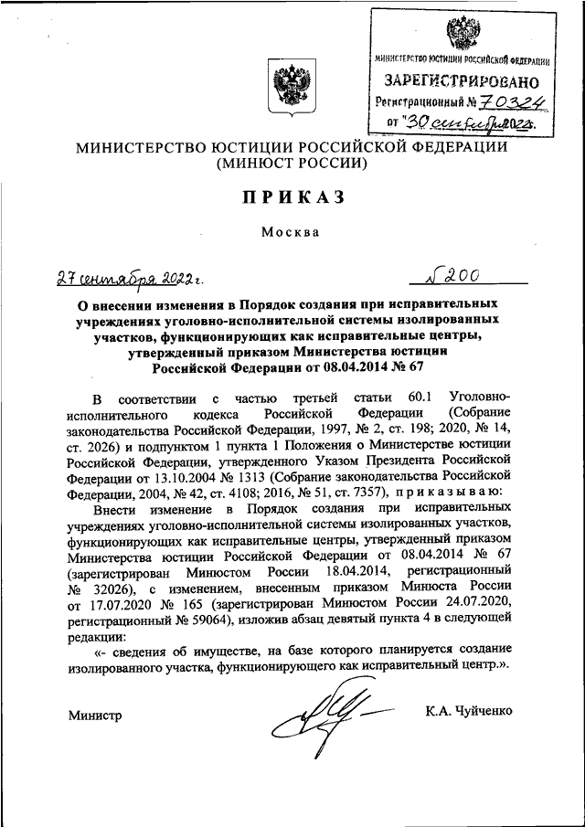 ПРИКАЗ Минюста РФ от 27.09.2022 N 200