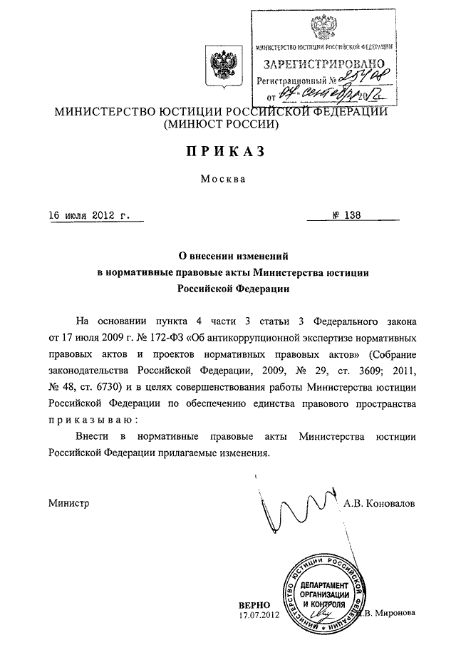 ПРИКАЗ Минюста РФ от 16.07.2012 N 138