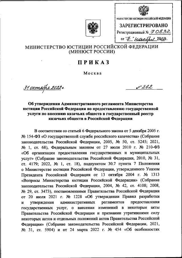 ПРИКАЗ Минюста РФ от 31.10.2022 N 262