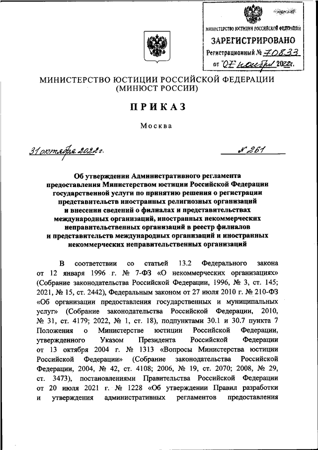 ПРИКАЗ Минюста РФ от 31.10.2022 N 261