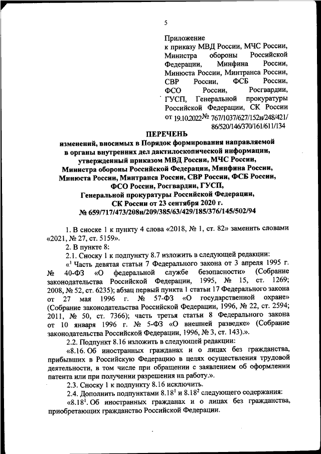 "О ВНЕСЕНИИ ИЗМЕНЕНИЙ В ПОРЯДОК ФОРМИРОВАНИЯ НАПРАВЛЯЕМОЙ В ОРГАНЫ ВНУТРЕННИХ ДЕЛ ДАКТИЛОСКОПИЧЕСКОЙ ИНФОРМАЦИИ, УТВЕРЖДЕННЫЙ ПРИКАЗОМ МВД РОССИИ, МЧС РОССИИ, МИНИСТРА ОБОРОНЫ РОССИЙСКОЙ ФЕДЕРАЦИИ, МИНФИНА РОССИИ, МИНЮСТА РОССИИ, МИНТРАНСА РОССИИ, СВР РОССИИ, ФСБ РОССИИ, ФСО РОССИИ, РОСГВАРДИИ, ГУСП, ГЕНЕРАЛЬНОЙ ПРОКУРАТУРЫ РОССИЙСКОЙ ФЕДЕРАЦИИ, СК РОССИИ ОТ 23 СЕНТЯБРЯ 2020 Г. N 659/717/473/208Н/209/385/63/429/185/376/145/502/94"
