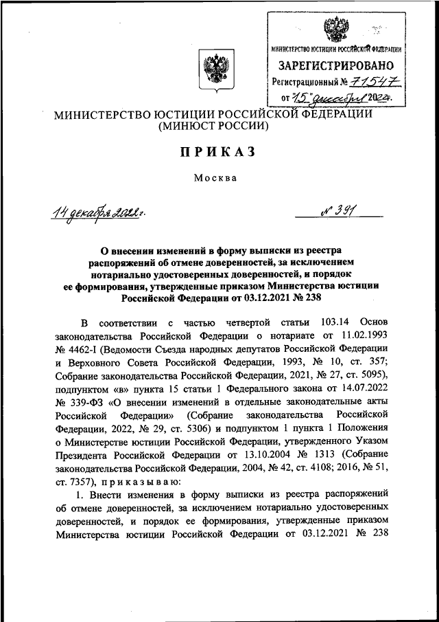 "О ВНЕСЕНИИ ИЗМЕНЕНИЙ В ФОРМУ ВЫПИСКИ ИЗ РЕЕСТРА РАСПОРЯЖЕНИЙ ОБ ОТМЕНЕ ДОВЕРЕННОСТЕЙ, ЗА ИСКЛЮЧЕНИЕМ НОТАРИАЛЬНО УДОСТОВЕРЕННЫХ ДОВЕРЕННОСТЕЙ, И ПОРЯДОК ЕЕ ФОРМИРОВАНИЯ, УТВЕРЖДЕННЫЕ ПРИКАЗОМ МИНИСТЕРСТВА ЮСТИЦИИ РОССИЙСКОЙ ФЕДЕРАЦИИ ОТ 03.12.2021 N 238"