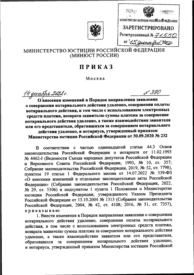 ПРИКАЗ Минюста РФ от 14.12.2022 N 390