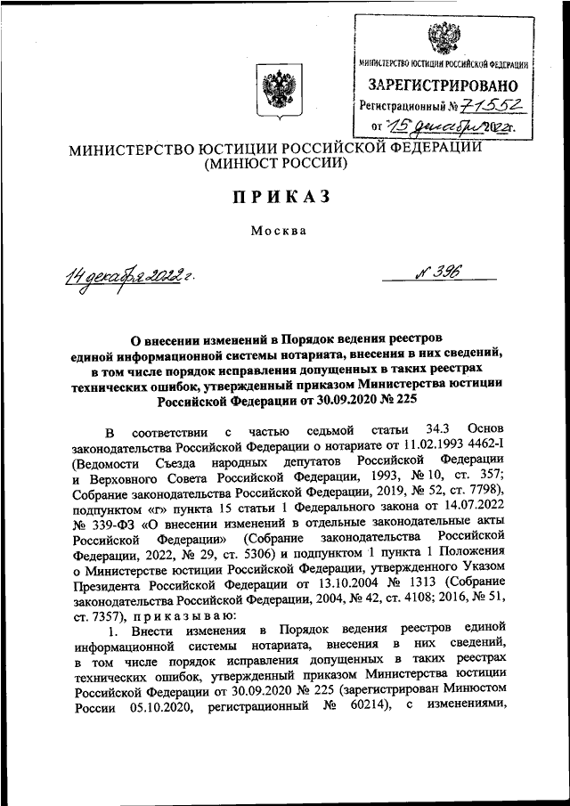 ПРИКАЗ Минюста РФ от 14.12.2022 N 396