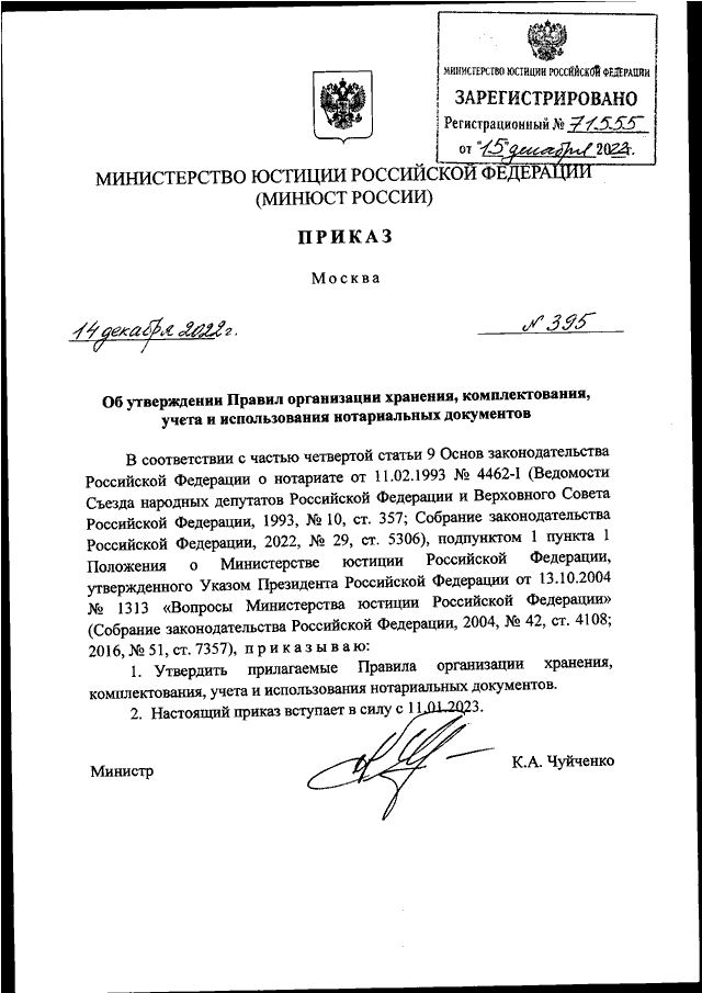 ПРИКАЗ Минюста РФ от 14.12.2022 N 395