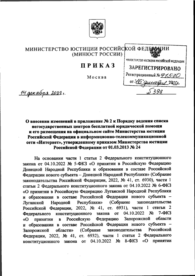 ПРИКАЗ Минюста РФ от 14.12.2022 N 398