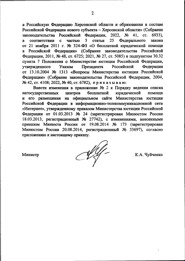 "О ВНЕСЕНИИ ИЗМЕНЕНИЙ В ПРИЛОЖЕНИЕ N 2 К ПОРЯДКУ ВЕДЕНИЯ СПИСКА НЕГОСУДАРСТВЕННЫХ ЦЕНТРОВ БЕСПЛАТНОЙ ЮРИДИЧЕСКОЙ ПОМОЩИ И ЕГО РАЗМЕЩЕНИЯ НА ОФИЦИАЛЬНОМ САЙТЕ МИНИСТЕРСТВА ЮСТИЦИИ РОССИЙСКОЙ ФЕДЕРАЦИИ В ИНФОРМАЦИОННО - ТЕЛЕКОММУНИКАЦИОННОЙ СЕТИ "ИНТЕРНЕТ", УТВЕРЖДЕННОМУ ПРИКАЗОМ МИНИСТЕРСТВА ЮСТИЦИИ РОССИЙСКОЙ ФЕДЕРАЦИИ ОТ 01.03.2013 N 24"