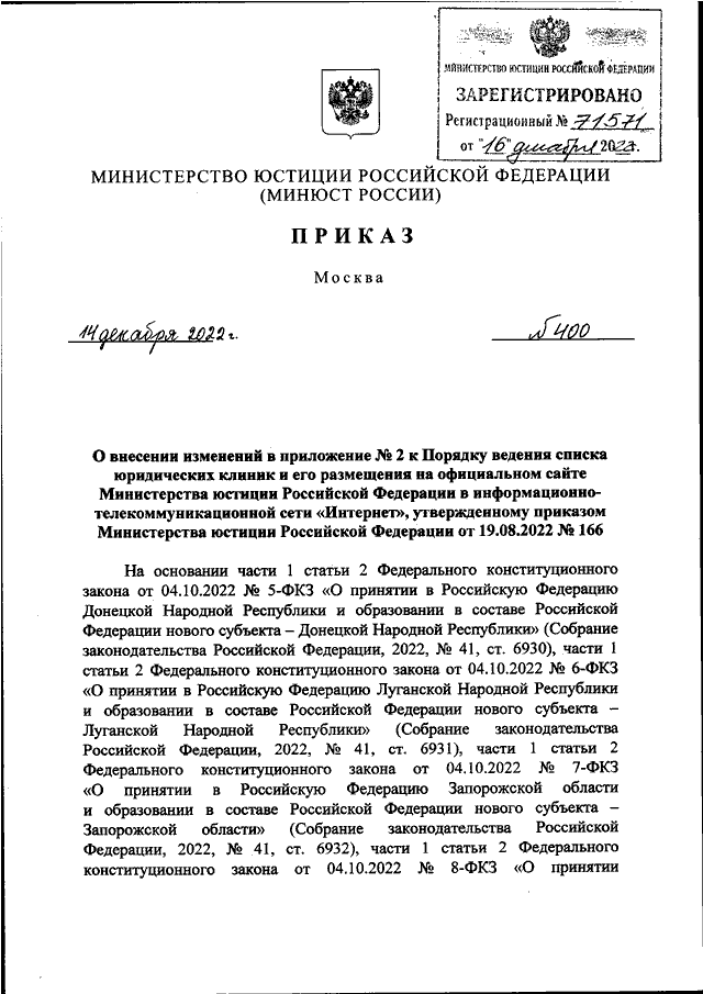 ПРИКАЗ Минюста РФ от 14.12.2022 N 400