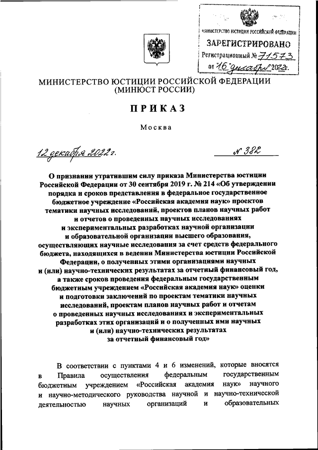 ПРИКАЗ Минюста РФ от 12.12.2022 N 382